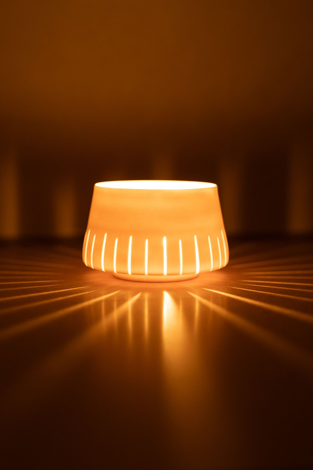 Filigrane Lichter, gegossen aus Porzellan, die durch ihre dezenten Durchbrüche schon während des Prozesses eine besondere Lichtstimmung zum Vorschein bringen. Gezielte Arbeitsschritte und der bewusste Umgang mit der Deformation des Materials während des Brandes, sind Basis für die charakteristische Silhouette der Cut-Lichter. Das transluzente Material lässt Kerzenlicht durch die Wandung dringen und schafft eine wärmende Atmosphäre.