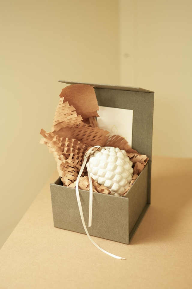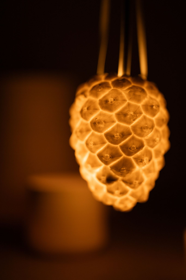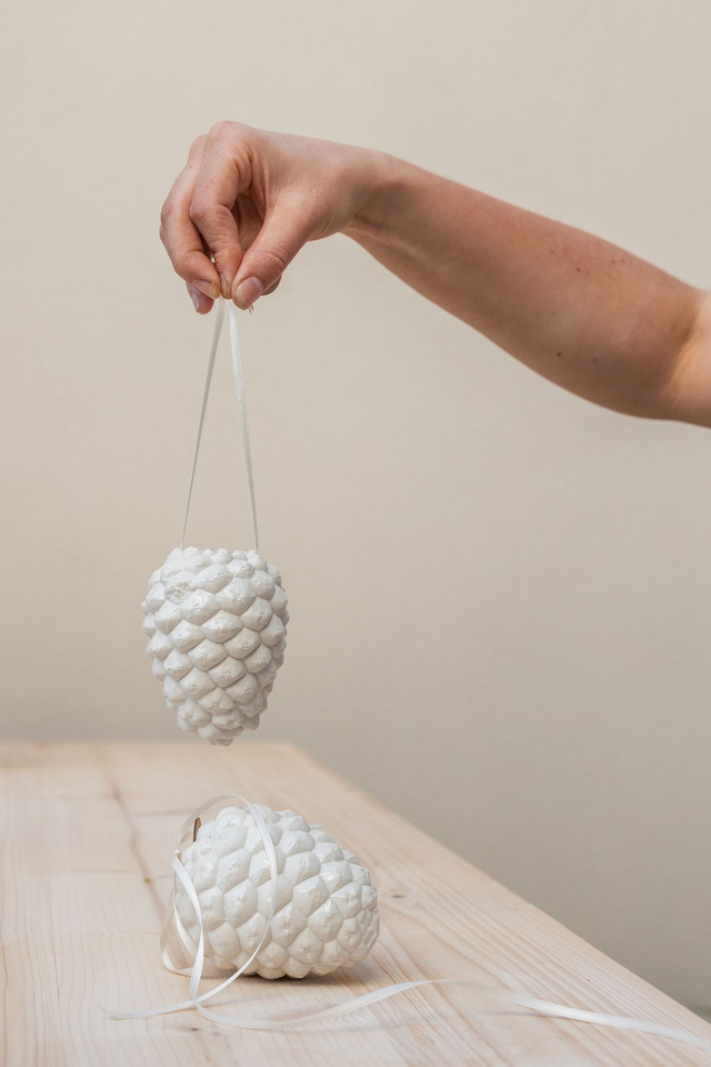 Pinienzapfen, gegossen aus feinstem Porzellan. Für einen lebhaften Glanz sind die dekorativen Zapfen teilweise glasiert. Jedes Stück ist lichtdurchlässig und mit einem Loch versehen. Dies ermöglicht die Kombination mit beispielsweise einer Lichterkette um den Zapfen besonders zu inszenieren. Jedes Stück ist eine Abformung eines Originals. Der handwerkliche Prozess belebt jeden Zapfen auf seine eigene Weise und Schafft Unikate in der Serie. Jeder Zapfen variiert in Größe, Formgebung und Textur, ganz nach den Vorbildern der Natur.