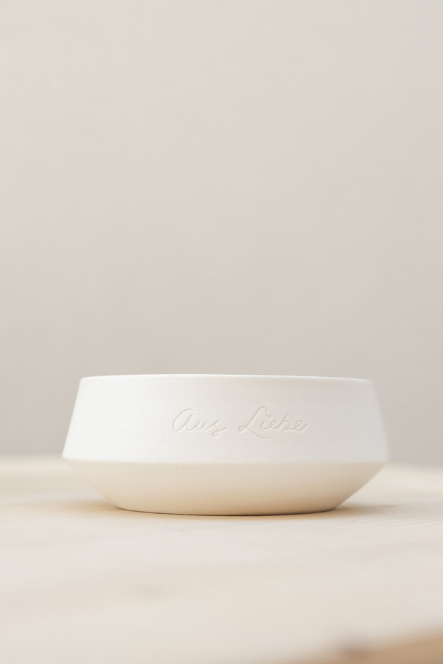 Eine schlichte Ringschale aus gegossenem Porzellan. Dieses Stück graviert mit dem Schriftzug "Aus Liebe". Die Lieferung erfolgt in einer sicheren Aufbewahrung.