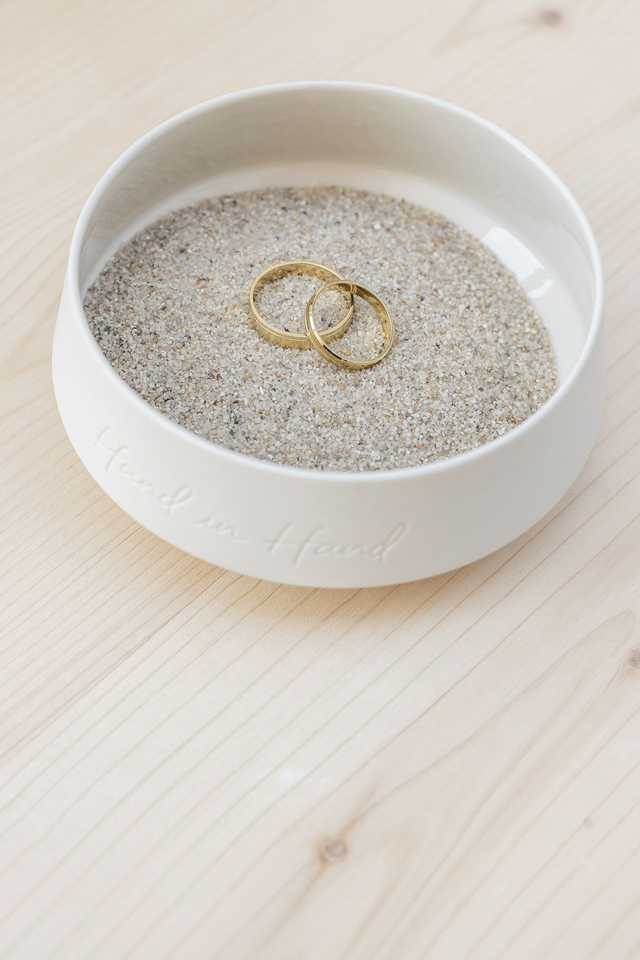 Eine schlichte Ringschale aus gegossenem Porzellan. Dieses Stück graviert mit dem Schriftzug "Aus Liebe". Die Lieferung erfolgt in einer sicheren Aufbewahrung.