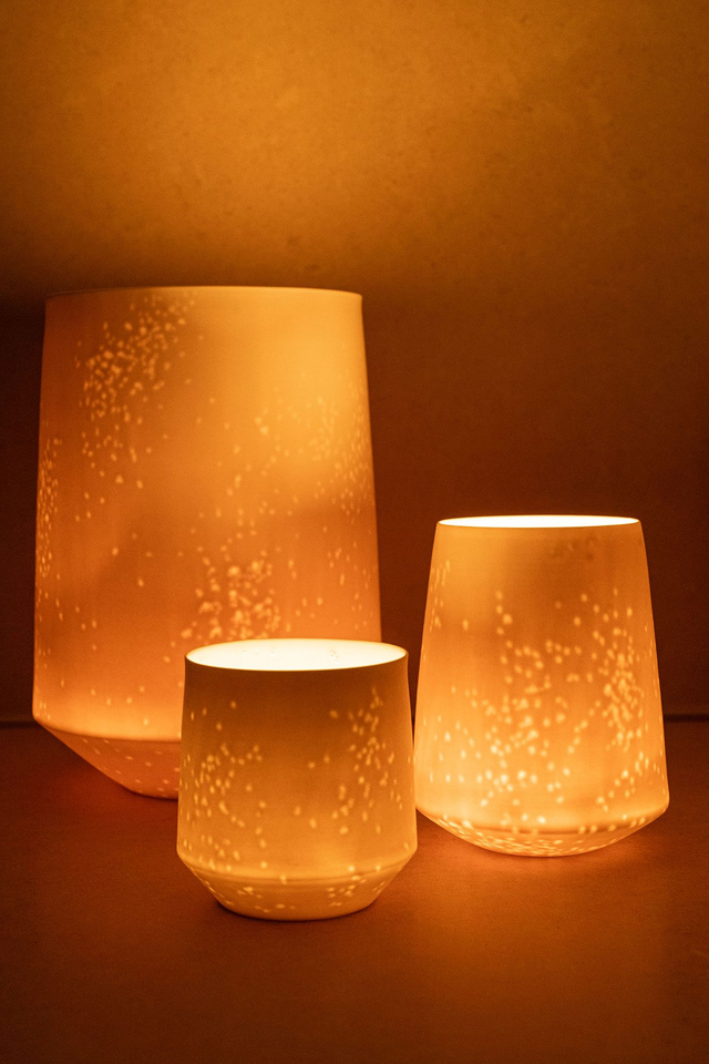 Hauchzartes Porzellan, gegossen mit floralen Intarsien. Jedes Stück ist ein Unikat und kann von der Abbildung variieren. Es werden Floralien aus der Natur verwendet, sodass die Materialien in Kombination mit dem Prozess ein Produkt entstehen lassen, welches einzigartig ist. Jedes Licht entsteht in liebevoller Handarbeit. Das Einarbeiten von Floralien und das Handling mit diesem empfindsamen Werkstoff kann charakteristische, leichte Verformungen zur Folge haben. Dies ist kein Grund zur Reklamation, sondern macht den Charme dieser Lichter aus, die für eine ganz besondere Atmosphäre sorgt.