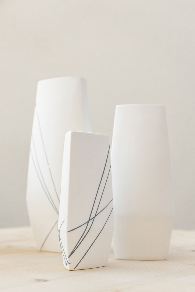 Die spannende Schnittstelle zwischen flächiger Struktur und räumlichem Objekt war Ausgangspunkt meiner Arbeit. Daraus entstand eine variantenreiche Produktserie, in sich kombinierbar. Filigrane Porzellanlinien werden gezielt gesetzt und schaffen Unikate in der Serie. Jedes Stück variiert und gleicht nicht der Abbildung. Dies ist nur eine mögliche Dekorvariante, Abweichungen von der Darstellung sind kein Grund zur Reklamation.
