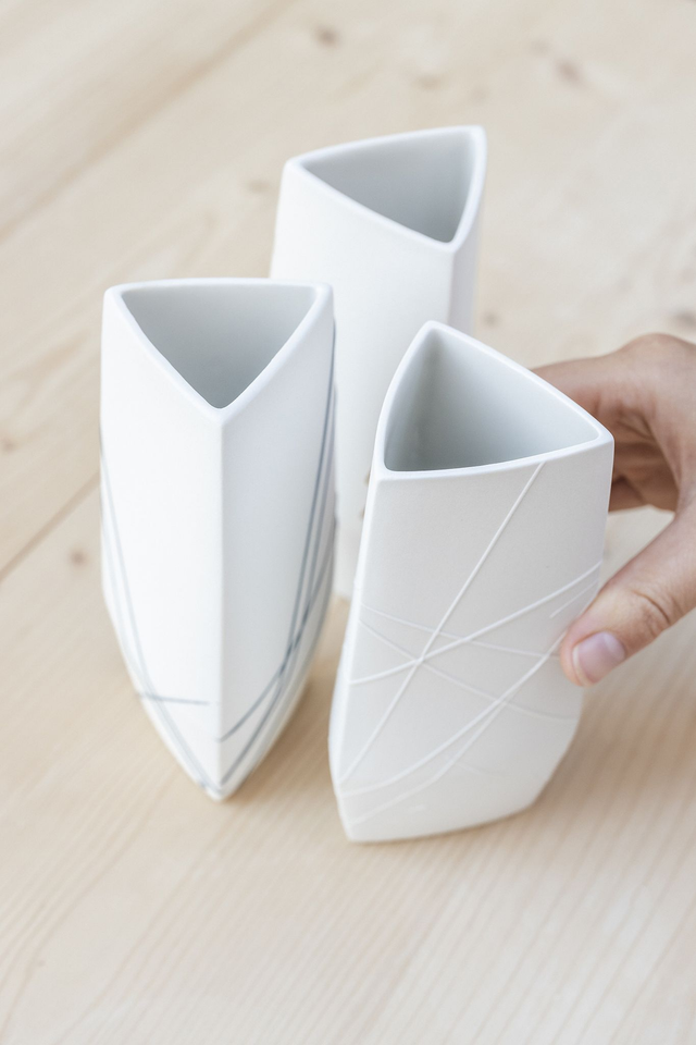 Die spannende Schnittstelle zwischen flächiger Struktur und räumlichem Objekt war Ausgangspunkt meiner Arbeit. Daraus entstand eine variantenreiche Produktserie, in sich kombinierbar. Filigrane Porzellanlinien werden gezielt gesetzt und schaffen Unikate in der Serie. Dieses Exemplar ist eine schlichte Variante ohne Dekor. Vor allem in Kombination ist es lohnenswert nicht jede Größe mit Dekoration zu wählen, um dass einzelne Stücke besser inszeniert werden.